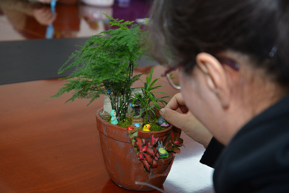 只见平日里敲键盘的纤纤玉手,拿起了小铲子和镊子。大家小心翼翼地取出多肉,找好位置,扎根填土,再点缀上一些彩色的铺面石。