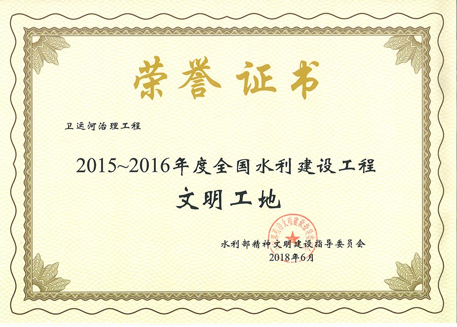 2015-2016年度全国水利建设工程文明工地 更新时间:2023-01-20 点击:2413 所属栏目:企业荣誉 Update Time:2023-01-20 Hits:2413 Belong Column:Honor